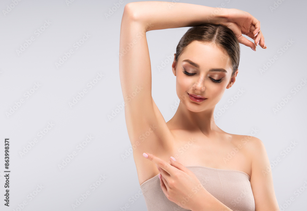 Armpit epilation, lacer hair removal. Young woman holding her arms up and showing clean underarms, depilation smooth clear skin .Beauty cosmetology portrait.