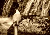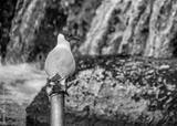 A seagull is sitting on a pipe against the background of a river in close-up.