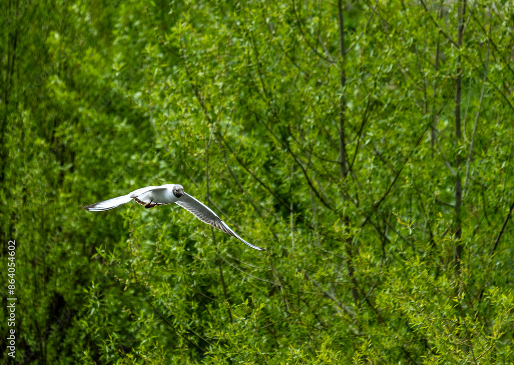 A seagull is flying in the air against a background of green trees.