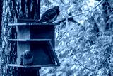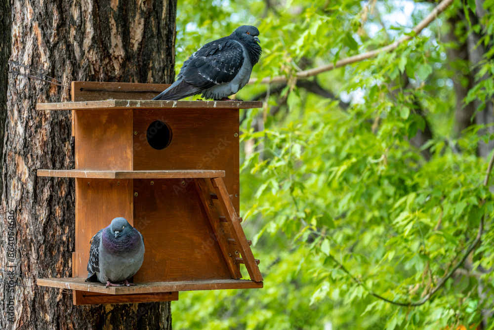 Pigeons are sitting on a birdhouse in the forest in close-up on a summer day.