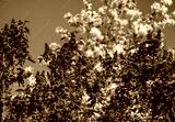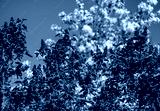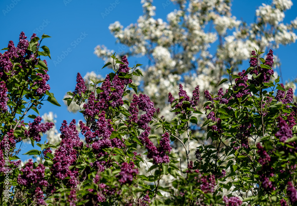 Blooming lilac on the background of a blooming apple tree in the park on a summer day.