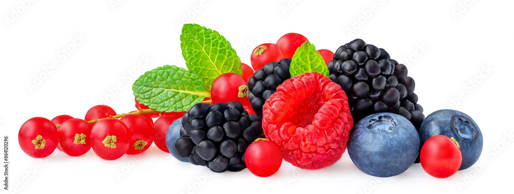 Mix of Berries isolated. Fresh Blueberry, blackberry, Currant berry, raspberry with leaves on white background. Package design element, closeup.