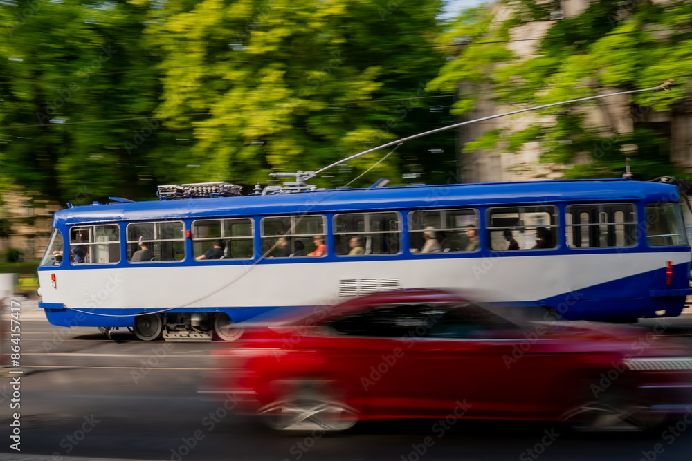Old blue and white colored tram trolley in motion in Riga, Latvia during heavy traffic transporting people in commute
