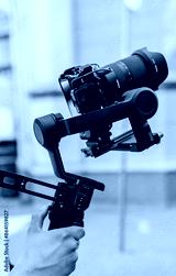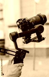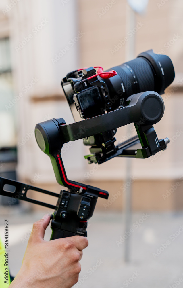 Close up of big camera in stabilization equipment for smooth filming