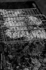 Grilling hot tasty brown chicken on hot charcoal grill in summer in Latvia