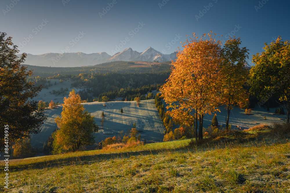 A beautiful autumn landscape of the Tatra Mountains seen from Polish Podhale during the golden hour. The sky is painted in warm hues, with the mountains bathed in golden light.
