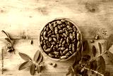 Wooden bowl with fresh honeysuckle berry on table top view. Organic superfood and healthy berry.