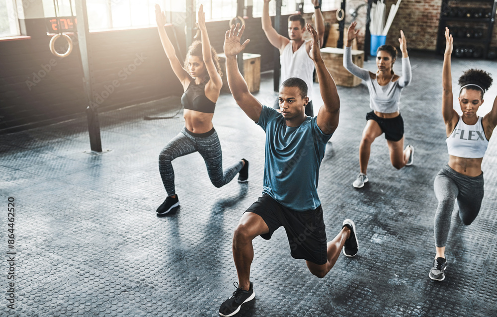 Friends, fitness and lunge in group at gym for workout, core exercise or training together indoors. Diverse class, people or warm up for ab muscle, session and sport for health challenge in gymnasium