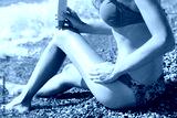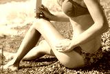 Pretty woman applying sunscreen lotion on her legs