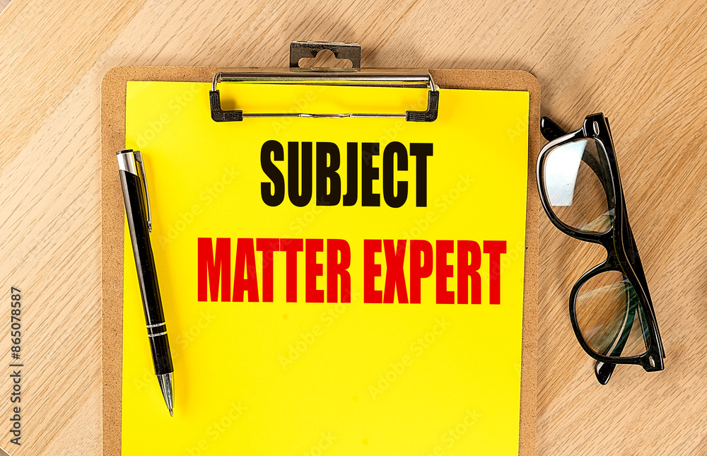 SUBJECT MATTER EXPERT text on yellow paper on clipboard with pen and glasses