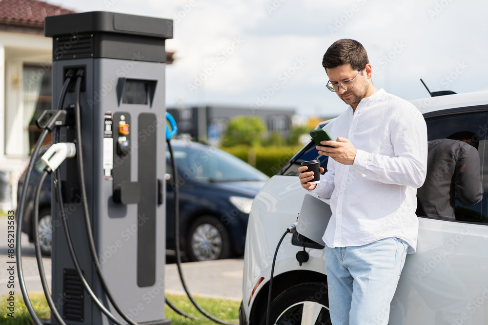 Man Charging Electric Car At Station While Using Smartphone on a Sunny Day