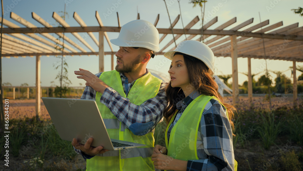 Two Caucasian experienced engineers workers woman female girl man male guy hardhat using laptop pc gadget device computer discuss talking project strategy examining construction online tech plan park