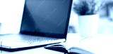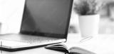 Silver pen lying on opened notebook sheet closeup in office with laptop pc on worktable. Inspector occupation for student examination or career strategy personal training course signature concept
