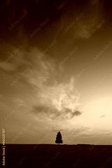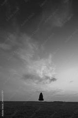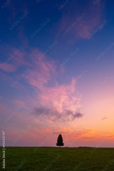 A beautiful summer sunrise with a single tree silhouette against the colorful sky. Natural morning landscape of rural Latvia, Northern Europe.