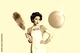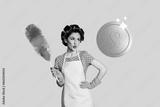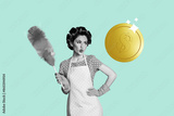 Composite trend artwork sketch photo collage of retro vintage picture obsolete style young woman housewife clean house earn money coins