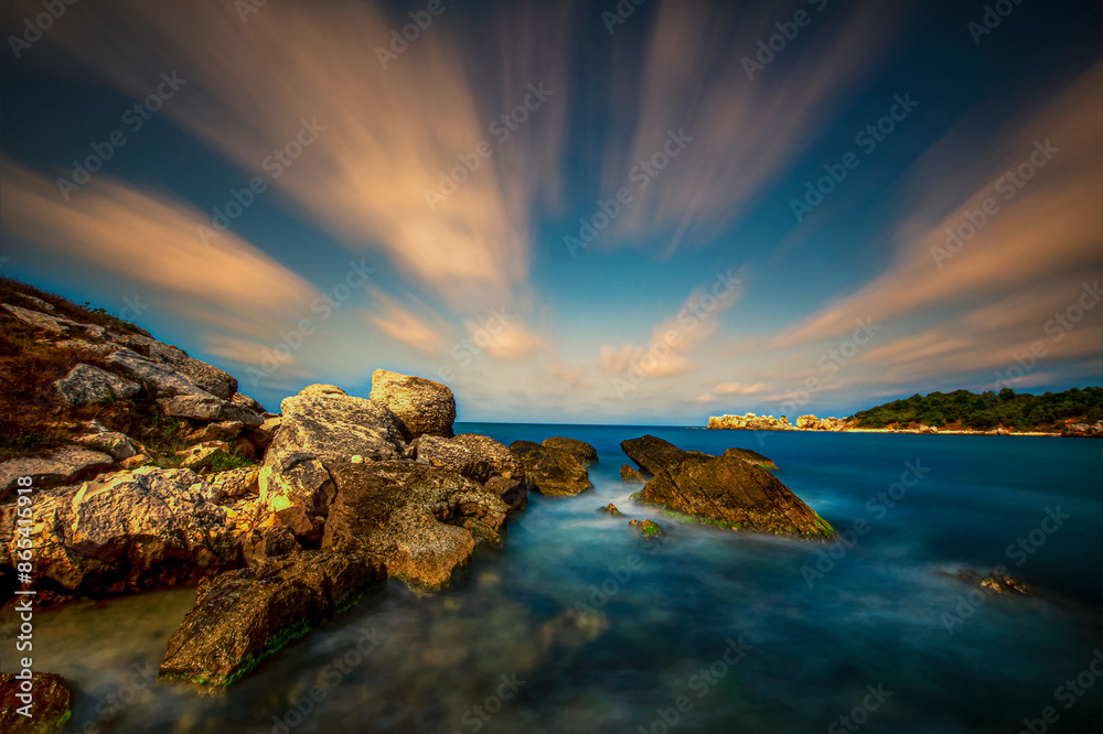Dramatic Coastal Sunset Over Rocky Shoreline. A breathtaking coastal scene at sunset, featuring dramatic, streaked clouds, and a calm, turquoise sea. Sile, Kandira, Kerpe, Kefken.