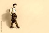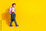 Full size photo of small charming boy backpack walk school wear trendy white outfit isolated on yellow color background