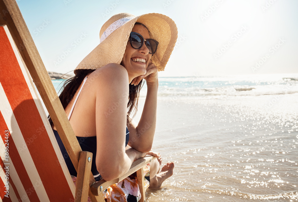 Woman, sunglasses and summer at beach with water, sand and relax for vacation by ocean by sunset. Female person, smile and happy on chair in Miami for tropical holiday or travel with mockup space