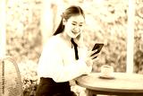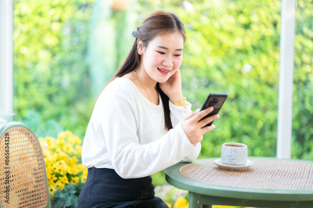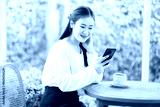 asian freelance people business female read writing message on smartphone using casual working with laptop computer for browsing internet, chatting and blogging and smartphone,notebook in coffee shop.