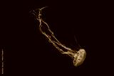 Atlantic sea nettle jellyfish, Chrysaora quinquecirrha, East Cost sea nettle, floating in illuminated aquarium with gree lighting. Theriology, biodiversity, undersea life, aquatic organism