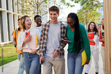 Cheerful group of multi-ethnic students walking towards the camera going to university classes, talking and laughing together.