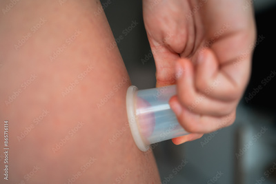 Close-up of a person using a silicone cup for anti-cellulite vacuum massage on the skin