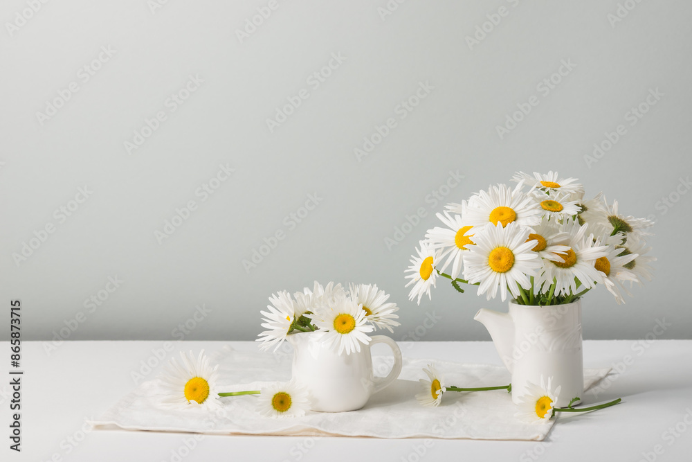 Two ceramic gravy boats, vases with white daisies. Summer mood, decor. Greeting card, copy space