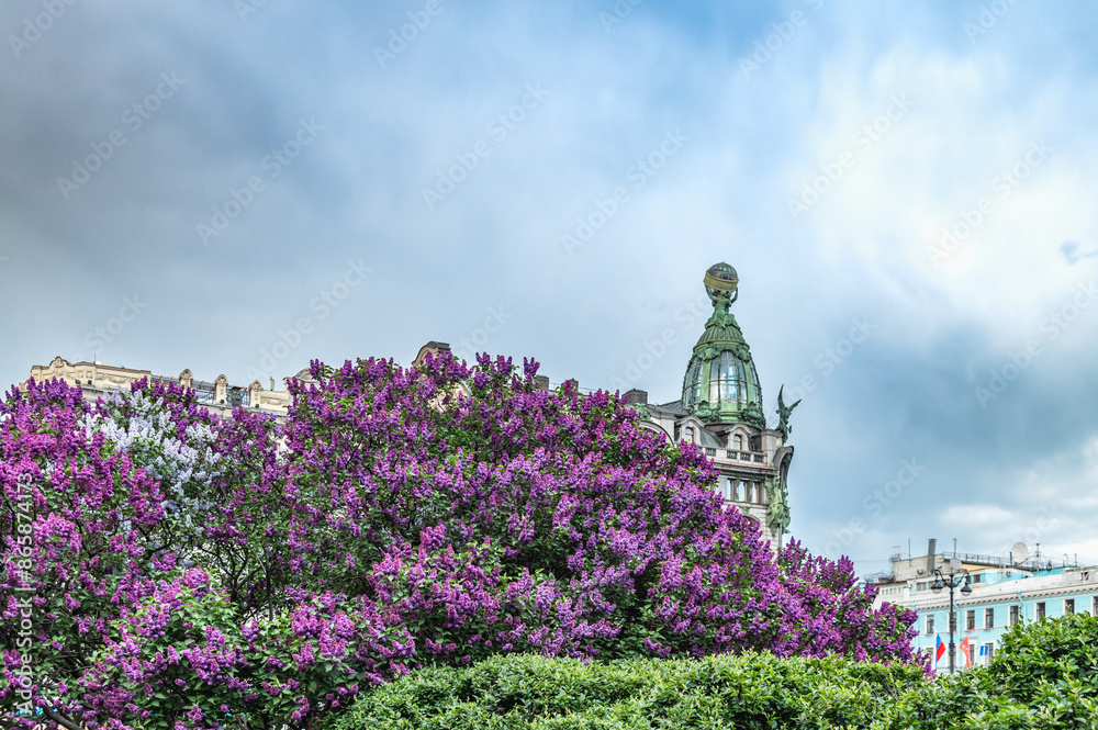 View of blooming lilacs and the dome of the House of Books (Singer House) in St. Petersburg. Spring in St. Petersburg.