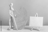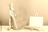 Creative composition with a miniature canvas on an easel, a wooden figurine of a person with a palette and an art brush. Artistic creativity concept.