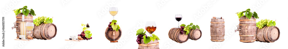 Wine bottles and glasses, an assortment of grapes and cheese isolated on white