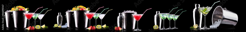 Different alcohol cocktails like beer, martini, soda, champagne, whiskey
