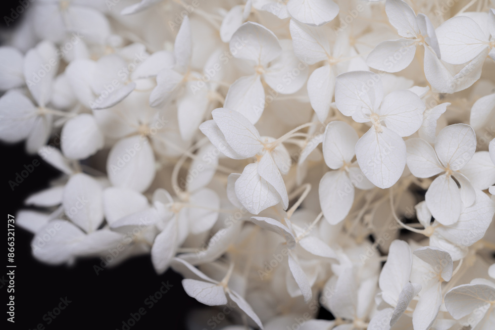 Hortensia hydrangea blooming white flowers on dark background spring garden macro