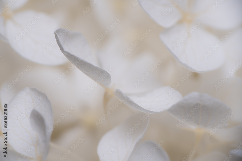Single Hortensia hydrangea blooming white flower on natural blur background macro