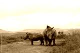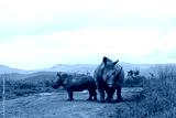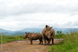 White rhinoceros (Ceratotherium simum) mother and calf walking around and feeding in Hluhluwe Game Reserve in South Africa