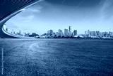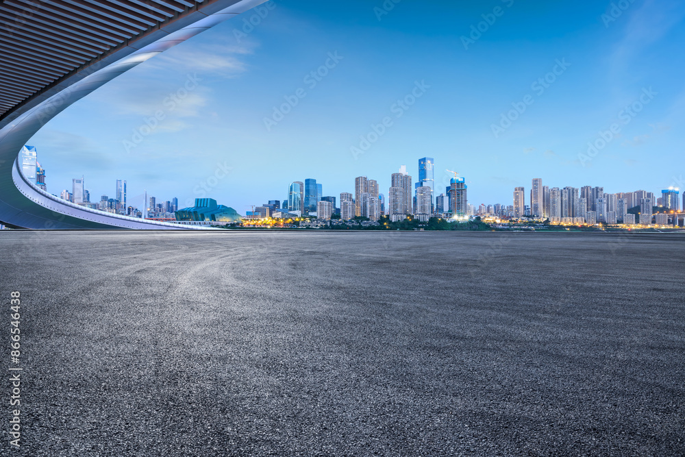 Asphalt road square and bridge with modern city buildings at night in Chongqing. car advertising background.