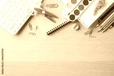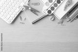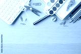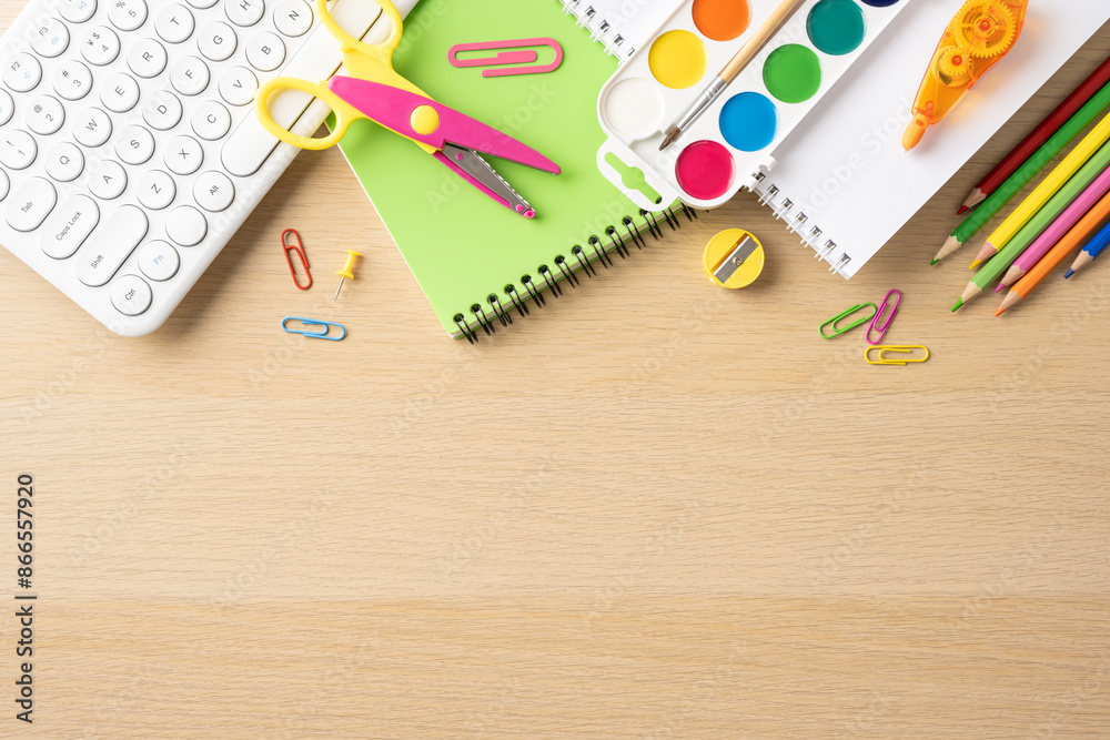 A variety of school supplies including scissors, colored pencils, paints, and keyboard arranged on a wooden desk