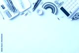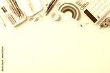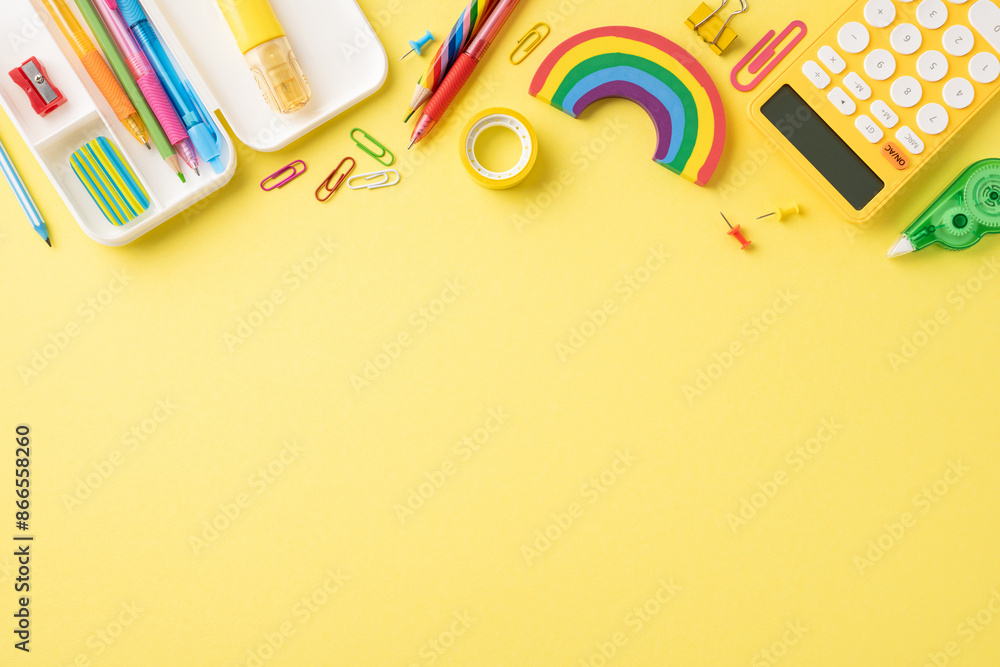 Bright and colorful school stationery items arranged on a yellow background, including pencils, calculator, and paper clips