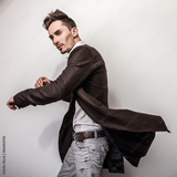 Elegant young handsome man in long stylish coat. Studio fashion portrait.