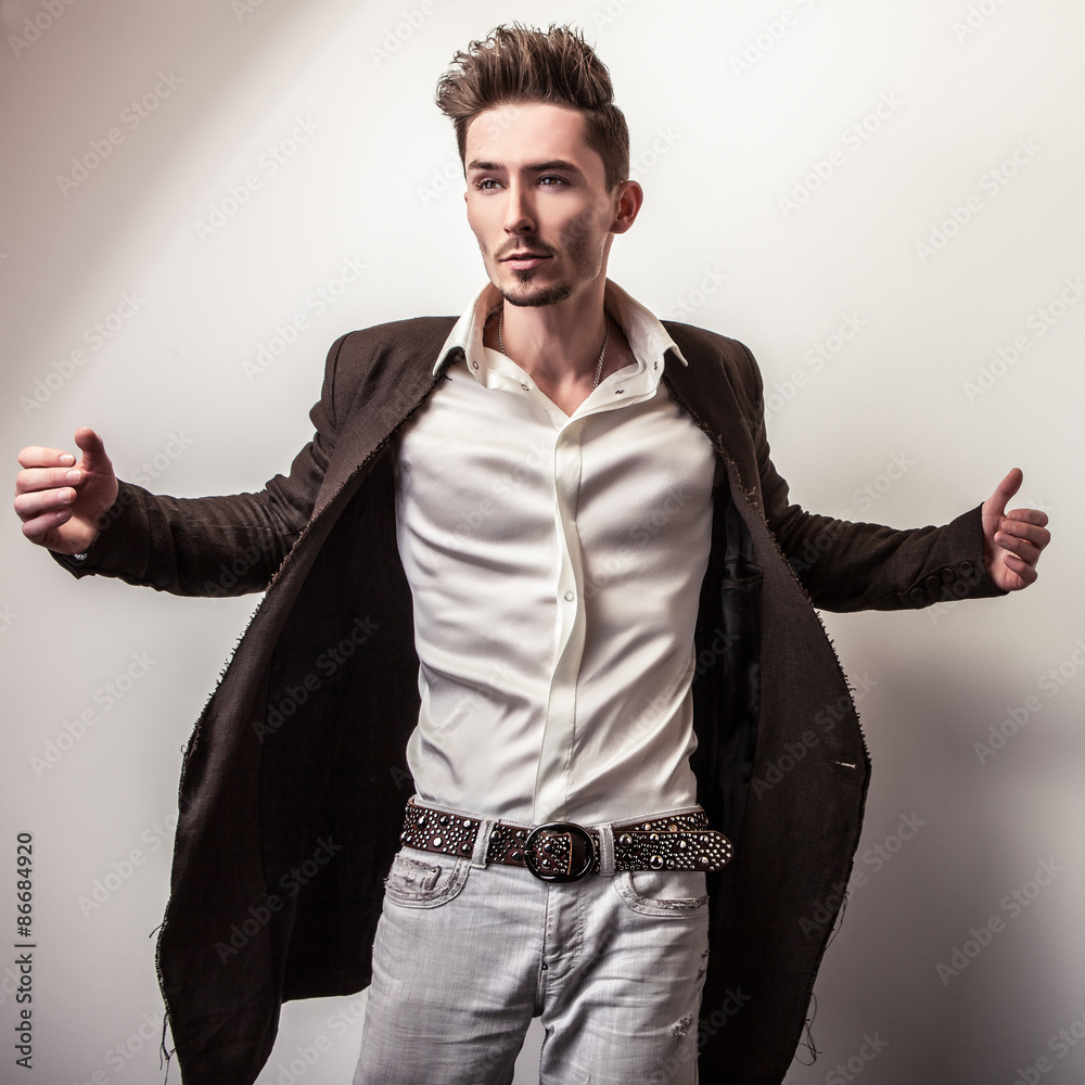 Elegant young handsome man in long stylish coat. Studio fashion portrait.