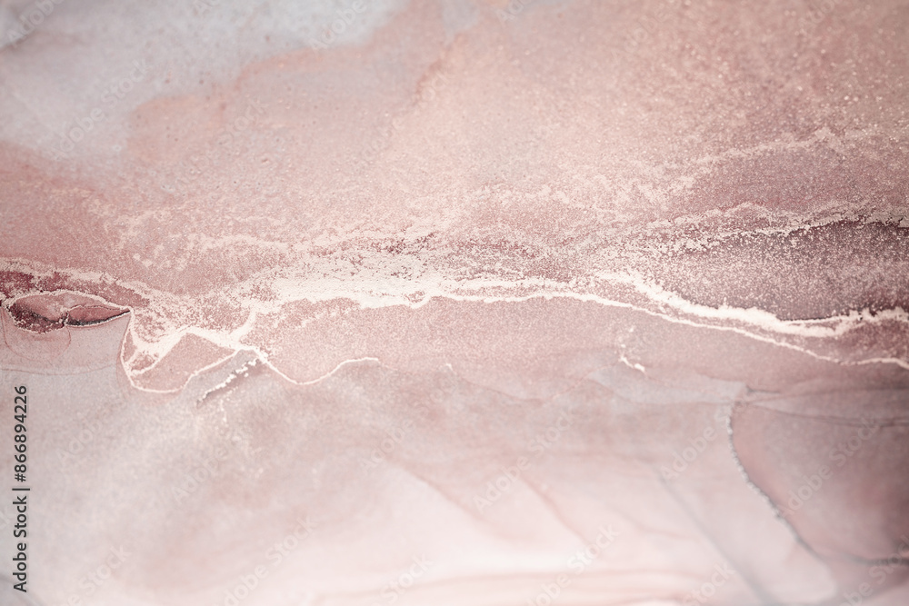 A close-up abstract image featuring swirling shades of pink and white with a delicate silver streak across the center, resembling a textured landscape