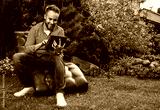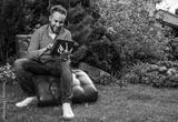 Young handsome man in casual clothes sit in luxury sofa with iPad in summer garden.