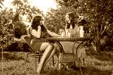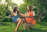 Two Smiling Young Women Toasting Drinks in Sunny Garden Setting, Enjoying Friendly Outdoor Celebration