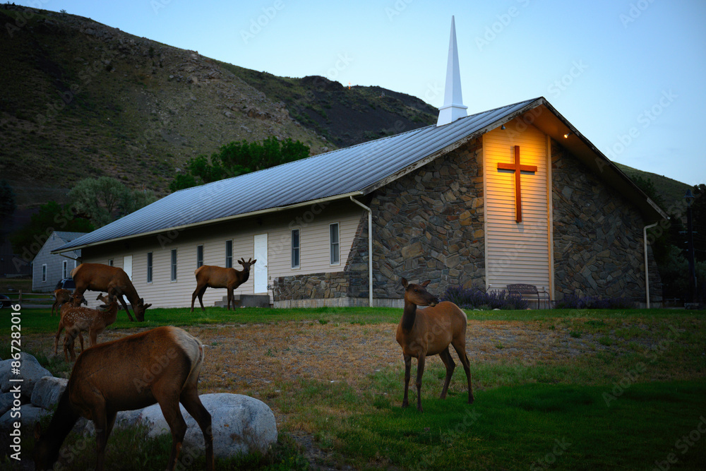 Elk family grazing in the church yard at dinner time in Gardiner, Montana: Peaceful wildlife herd in town on the Northern Range of Yellowstone of United States