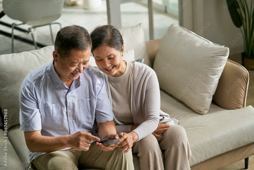 senior asian couple using cellphone together at home