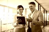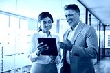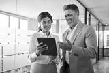 Professional mature business people, two happy middle aged business man and woman executives partners team working together checking corporate results collaborating standing in company office.