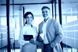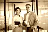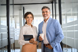Portrait of two happy executives business man and woman partners in office. Middle aged managers, mature businessman and businesswoman leaders professional team standing at work looking at camera.