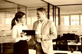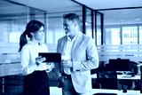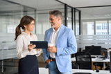 Happy professional smiling businessman and businesswoman having conversation at work. Executives team of two business people working talking using tablet technology standing in corporate office.