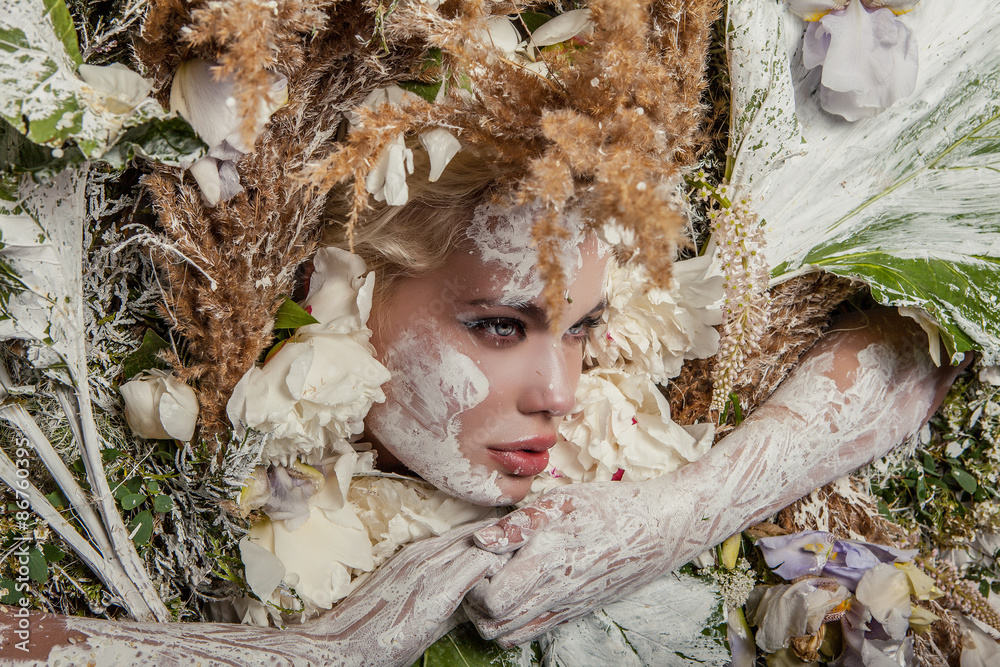 Fairy tale girl portrait surrounded with natural plants and flowers. Art image in bright fantasy stylization.