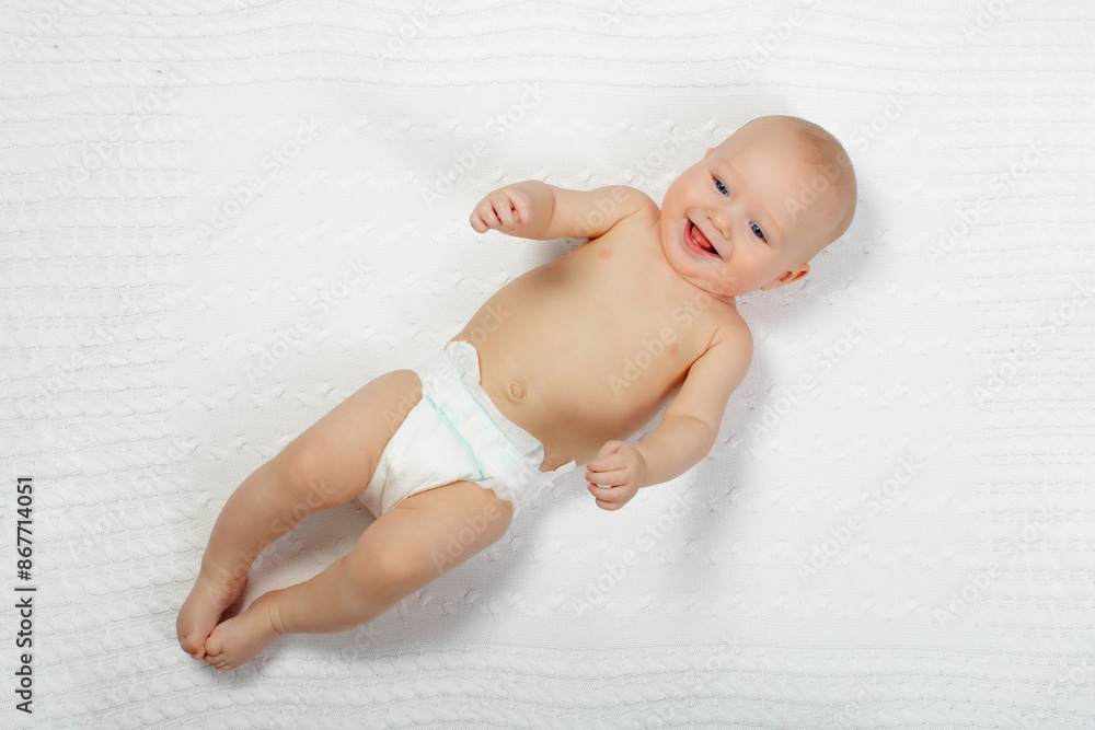 Little baby on white bed