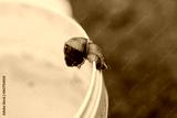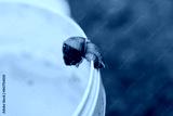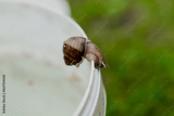 Big snail crawling on a side of white bucket close up. Snail overcoming obstacles